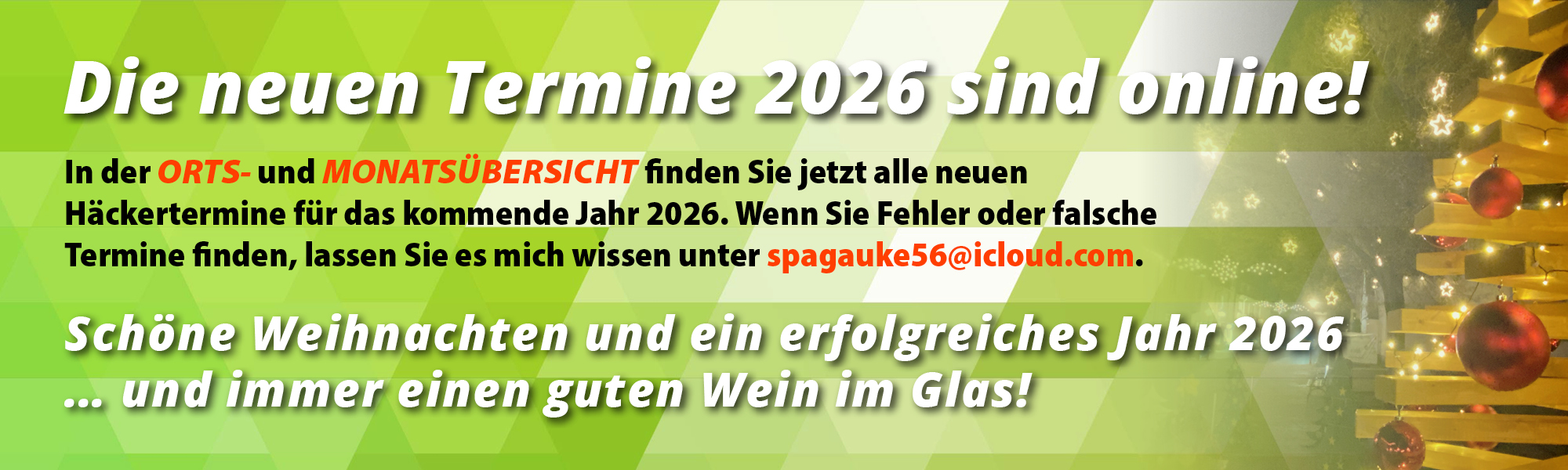 Wenn Sie in der untenstehenden Liste auf den Namen der Häckerwirtschaft klicken, werden Sie zur jeweiligen Seite des Weinbaubetriebs weitergeleitet. Dort finden Sie weitere Informationen zu Terminen dieses Betriebes.